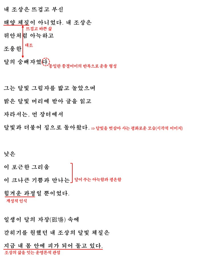 - 1연에서 화자는 조상이 태양 체질이 아닌 달빛 체질이었다고 말합니다.