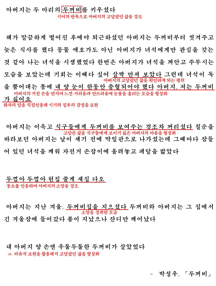 - 은유법: '아버지의 손'을 '두꺼비'로 비유하여 아버지의 삶을 생생하게 그려냈습니다.