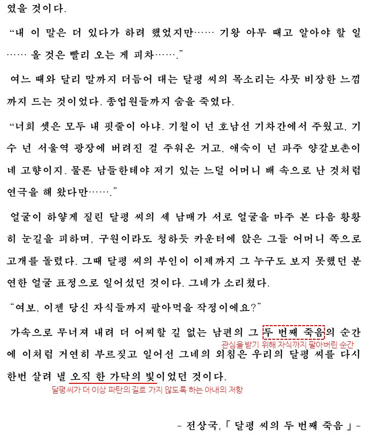 이렇게 오늘은 '달평 씨의 두 번째 죽음'대해 알아보았습니다. 해설을 읽은 후 다시 한 번 본문에 정리된 내용을 읽으며 학습을 마무리해봅시다.