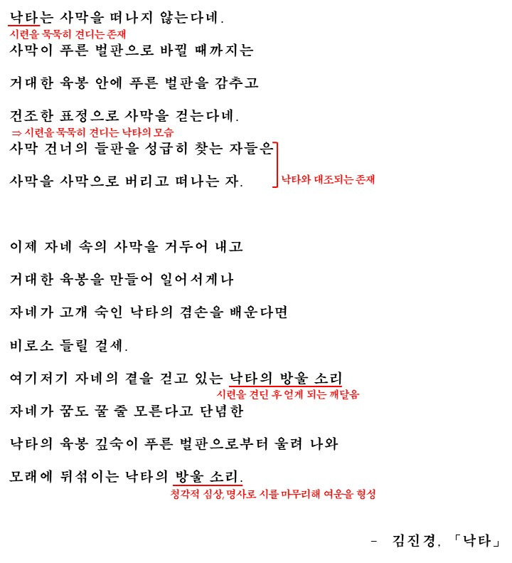 대대로 오아시스를 이야기 할 수도 있듯이 일시적인 휴식을 말할 수 있겠지만 화자는 사막 건너의 푸른 들판이라는 희망을 이야기 하진 않겠다고 하고 있습니다. 그러면서 절망의 벼락에서 스스로 거대한 육봉(희망)을 만들어 낼 때까지 묵묵히 자네가 절망하는 사막을 가리키겠다며 힘겨운 삶을 살아가는 인간에게 희망을 제시하기보다는 스스로의 내면에서 이를 견뎌낼 수 있는 힘을 길러야 함을 강조합니다. 즉, 화자는 눈앞의 어려움을 다른사람을 통한 희망으로 피하지 않고 스스로의 내면에서 이를 극복할 것을 요구하고 있는 것입니다.