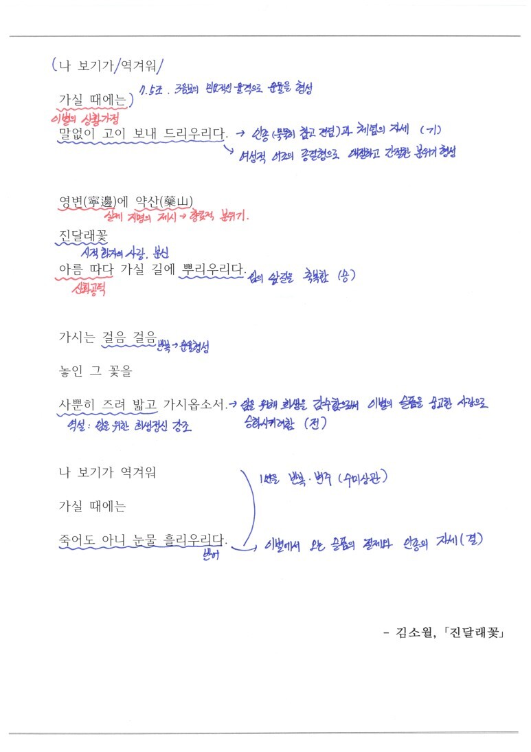 문제를 풀기 위해 시를 처음 공부하는 입장에서는 표현법과 상황파악, 화자의 정서 파악을 공부하기에 좋고, 그냥 감상하기에도 슬픈 감정을 느끼기에 참 좋은 시 진달래 꽃.