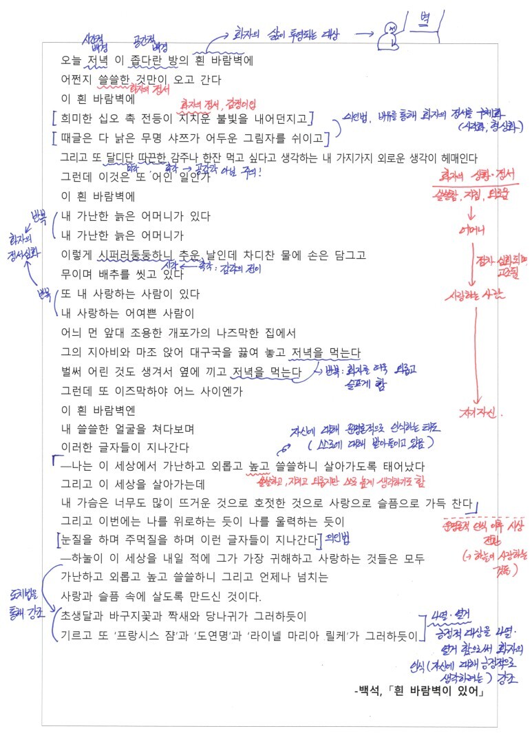 시인은 저녁 무렵 좁다란 방에 혼자 외롭게 앉아 있습니다. 그런 시인 앞 벽으로 자신의 삶과 연관된 것들이 비춰십니다.(빔프로젝트로 화면을 쏘는 것과 같이 시인의 인생이 흰 바람벽에 투연된다고 보면 됩니다.) 먼저, 어머니 입니다. 가만히 불러만 봐도 눈물나는 그 이름 어머니, 그런데 그냥 어머니가 아닙니다. 가난하고 늙은 어머니입니다. 그런 어머니가 심지어 추운 겨울 배추를 씻는 고된 노동을 하고 있습니다. 화자의 슬픔은 더 심해집니다. 이번엔 사랑하는 사람입니다. 중요한 것은 사랑하는 사람을 표현했다는 것입니다. 아직도 사랑하는 대상이라는 거죠. 심지어 어여픈 사람이라고 표현합니다. 그런데말입니다. 그런 사람이 다른 남자와 결혼해서 애를 낳고 오붓하게 밥을 먹는 모습이 지나갑니다. 시인의 마음은 더욱 슬프죠. 맘이 무너집니다. 무너져ㅠ이후 자신의 쓸쓸한 얼굴이 비춰집니다. 이를 통해 시인은 자신의 현재 상황을 받아들입니다.(자신에 대한 성찰)그리고 그후 자신은 가난하고 외롭고 높고 쓸쓸하지만 하늘이 이 세상을 내일 적에 그가 가장 귀해하고 사랑하는 것들은 모두 그렇게 만들었다며(시상의 전환) 스스로를 위로하고 시를 마치게 됩니다.