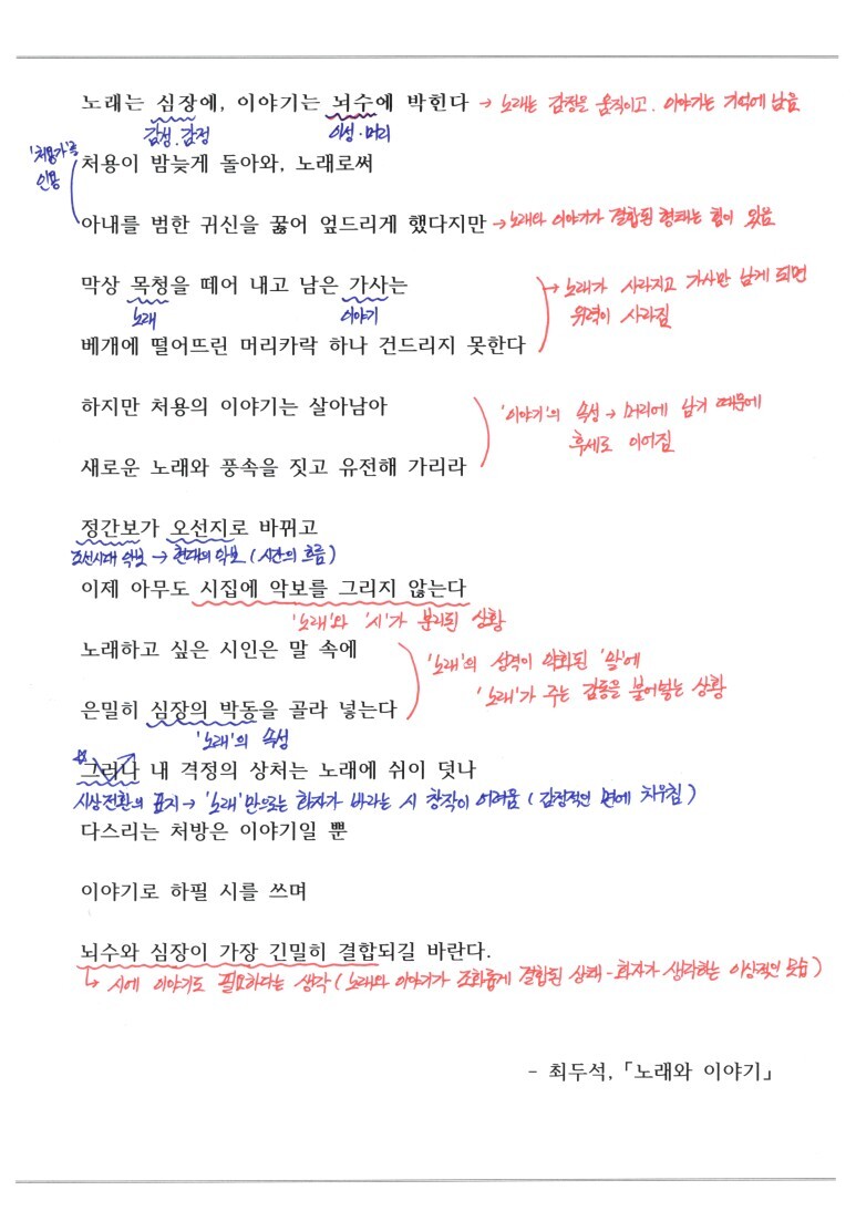 '노래'와 '이야기'의 속성을 말하며 시작하는 이 시는 '처용'이 부른 '노래'와 '처용'에 대한 '이야기'의 성격을 비교하여 주제를 구체화하고 있습니다. 그리고 마지막에 시에 노래가 필요하지만 노래만으론 감정적인 면에 치우치기 쉬우니 이야기도 필요하다는 화자의 소망을 드러내고 있는 것이죠.