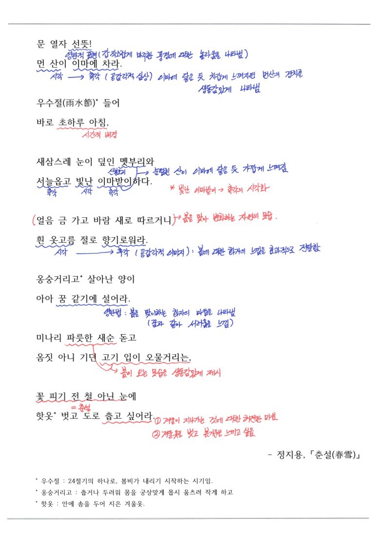 계절의 변화하는 시기에는 새로운 계절에 대한 설렘과 함께 지나가는 계절에 대한 아쉬움이 함께 다가옵니다. 이번에 다룰 시 '춘설'에서도 시인은 때늦은 눈(봄에 내린 눈=춘설)을 보며 지나간 겨울에 대한 허전함과 다가오는 새 봄에 대한 기대를 드러내고 있습니다.